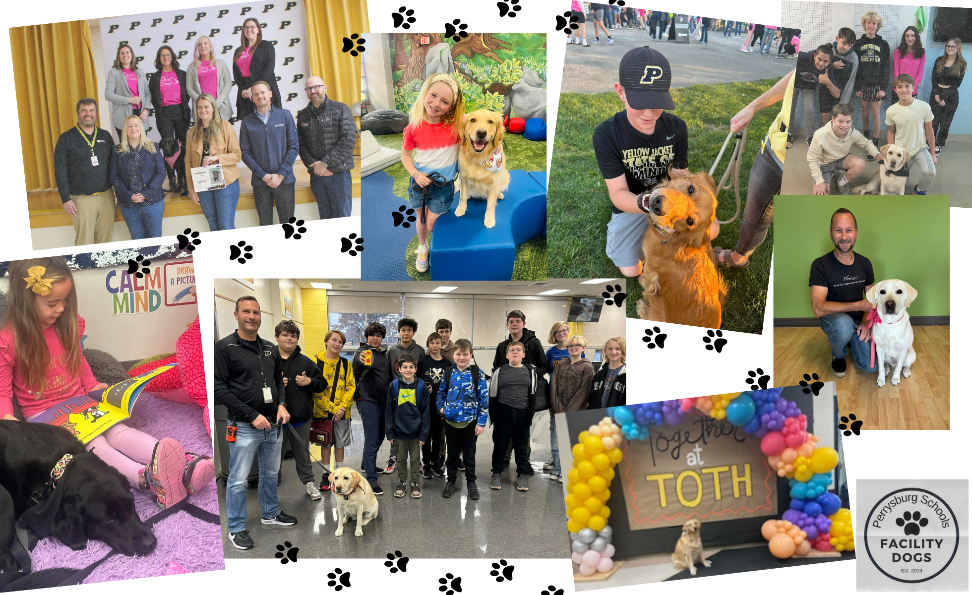 The Perrysburg Schools Facility Dog Program first began at Perrysburg High School in 2019. Trained facility dogs are now placed in six of our schools with trained handlers – Perrysburg High School (Taft), Perrysburg Junior High School (Salts), Hull Prairie Intermediate (Kincaid), Toth Elementary School (Aspen), Frank Elementary School (Liv), and Woodland Elementary School (Angel). As of the 2025/2026 school year, there is one additional dog currently “in-training” within the school district at Fort Meigs Elementary School.